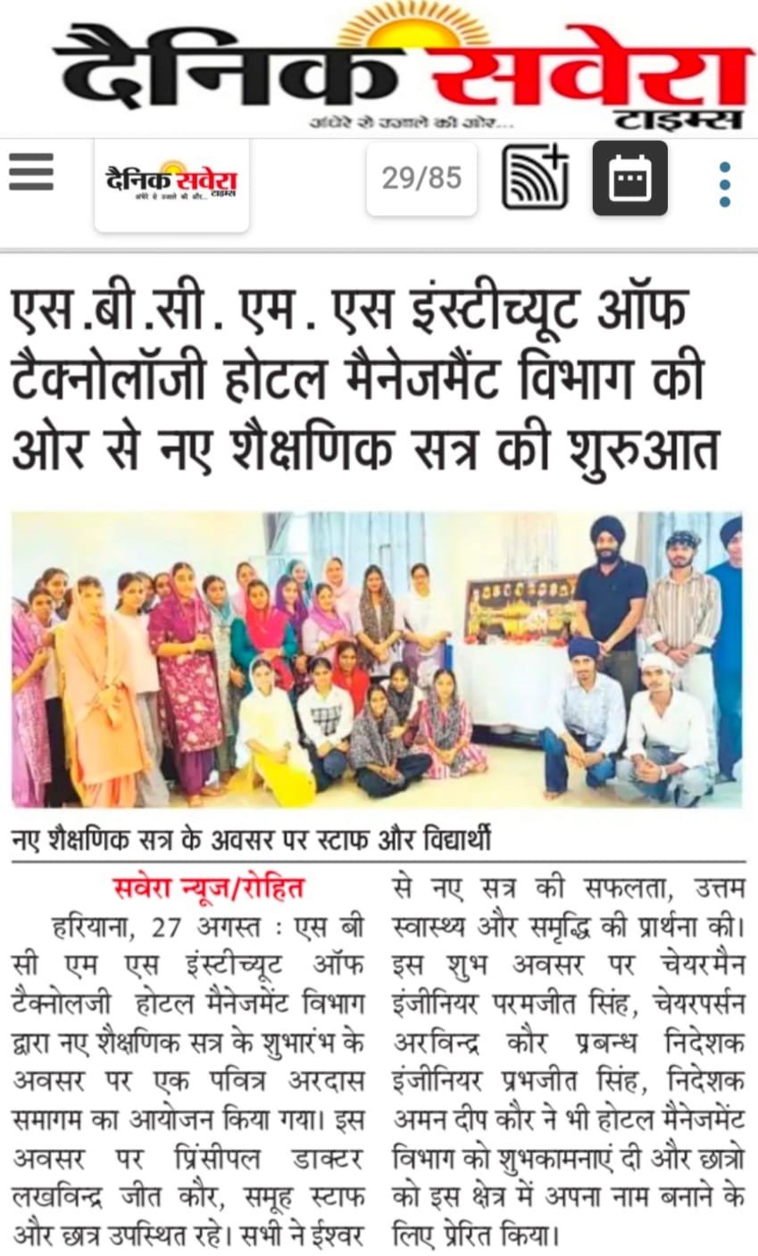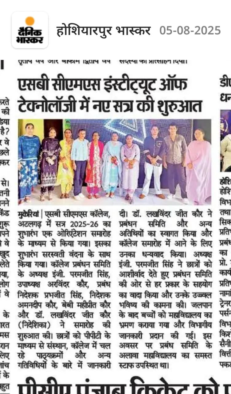 SBCMS Institute of Technology was started in year 1997 with its pious mission to promote technical education in the area of Attalgarh (Mukerian), District Hoshiarpur & its surrounding areas to provide opportunity to young boys & girls to assert themselves and overcome the challenges of the 21st century in the field of technology. SBCMS Polytechnic College is conveniently located at a distance of 2KM from the heart of the city, Mukerian. The College is affiliated to the Punjab State Board of Technical Education and Industrial Training, Chandigarh and is recognized by All India Council of Technical Education (AICTE), Government of India, New Delhi and Punjab Government.